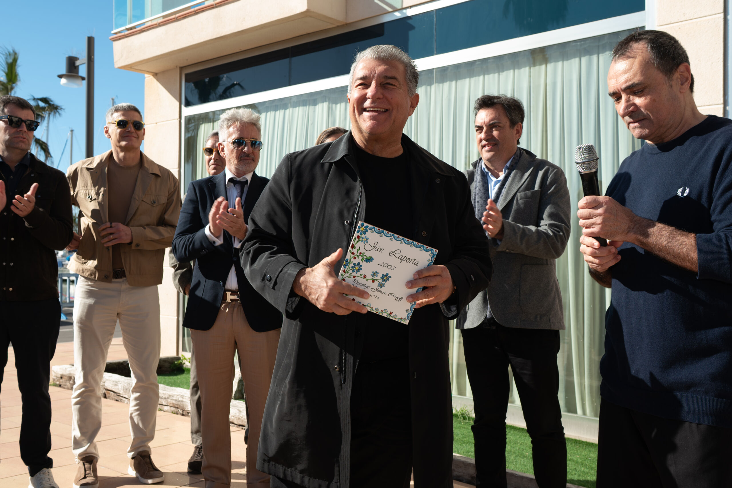 The event also served to present Laporta with a replica of his own commemorative tile, which will be installed in the coming months in the Johan Cruyff Passage, an area located on the Football Stars Avenue within the Aiguadolç Municipal Football Stadium. The creation of this tile was conceived by the Veterans de Sitges Foundation, and it was presented by Alejandro Sacristán, son of former footballer Eusebio Sacristán.